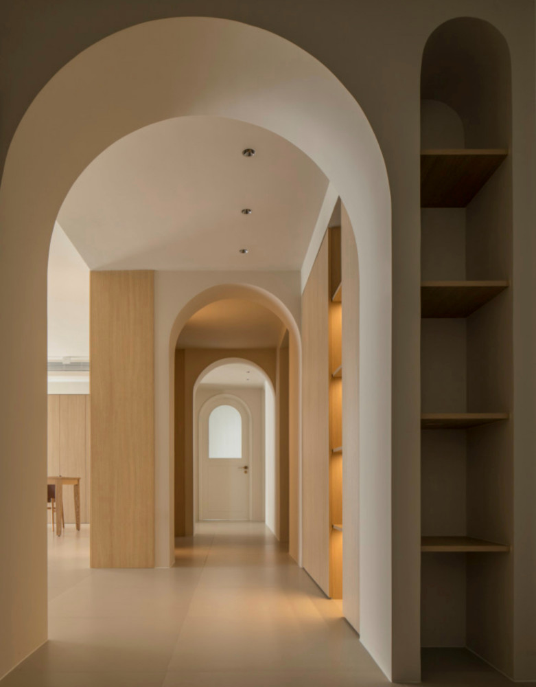 如果要做拱形门洞,不仅是阳台、走廊这些地方需要做,要得全屋呼应,必须给卧室门、卫生间门这些地方,也得安排上。