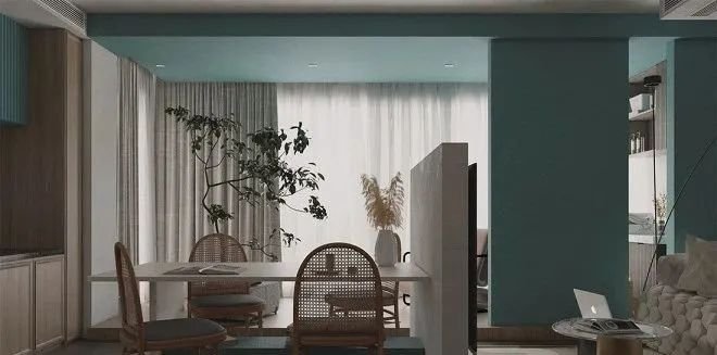沙发可以不靠墙放,让空间更加灵活的同时,还能承担额外的其他功能。沙发后面可以做一整面储物柜、放一张餐桌或书桌、甚至能直接隔出另外一个房间。